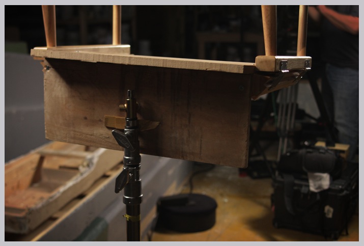 I drove to set with all the pieces ready to go. By the time I got there, interviews needed to happen fast so I was really rushing to get it built. I realized that I left the most important drill bit in my car which was too far away at the moment so, I had to use these thick screws which actually broke the wood in a couple of spots. I attached a plank to the two sides of the chair where the seat exists and another plank to the back. I found a grip who let me borrow a smaller drill bit and I stabalized it a bit with the two L-brackets. Finally, I drilled into the back plank and attached my special connector from Filmtools.